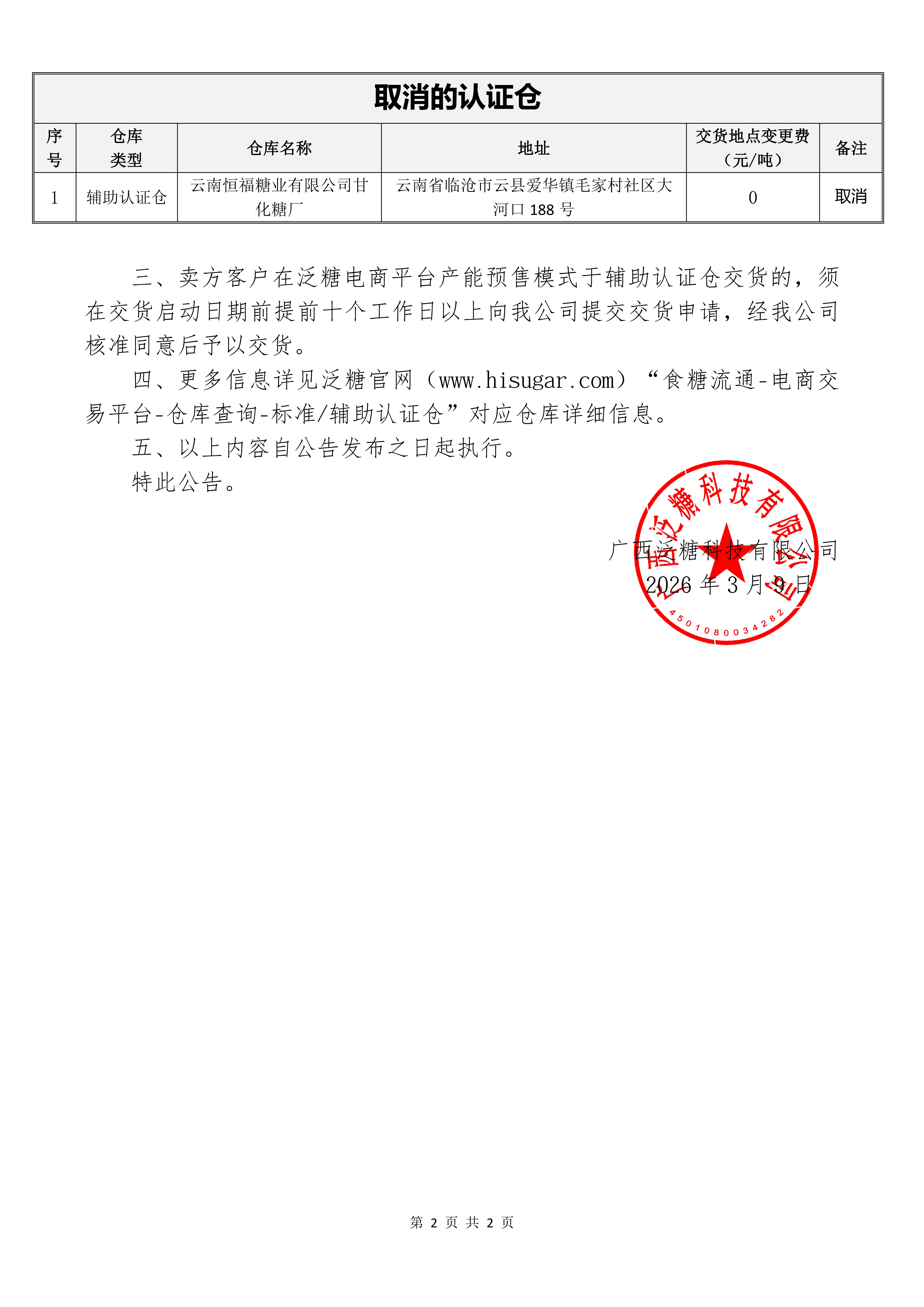 关于新增和调整部分泛糖认证仓的公告