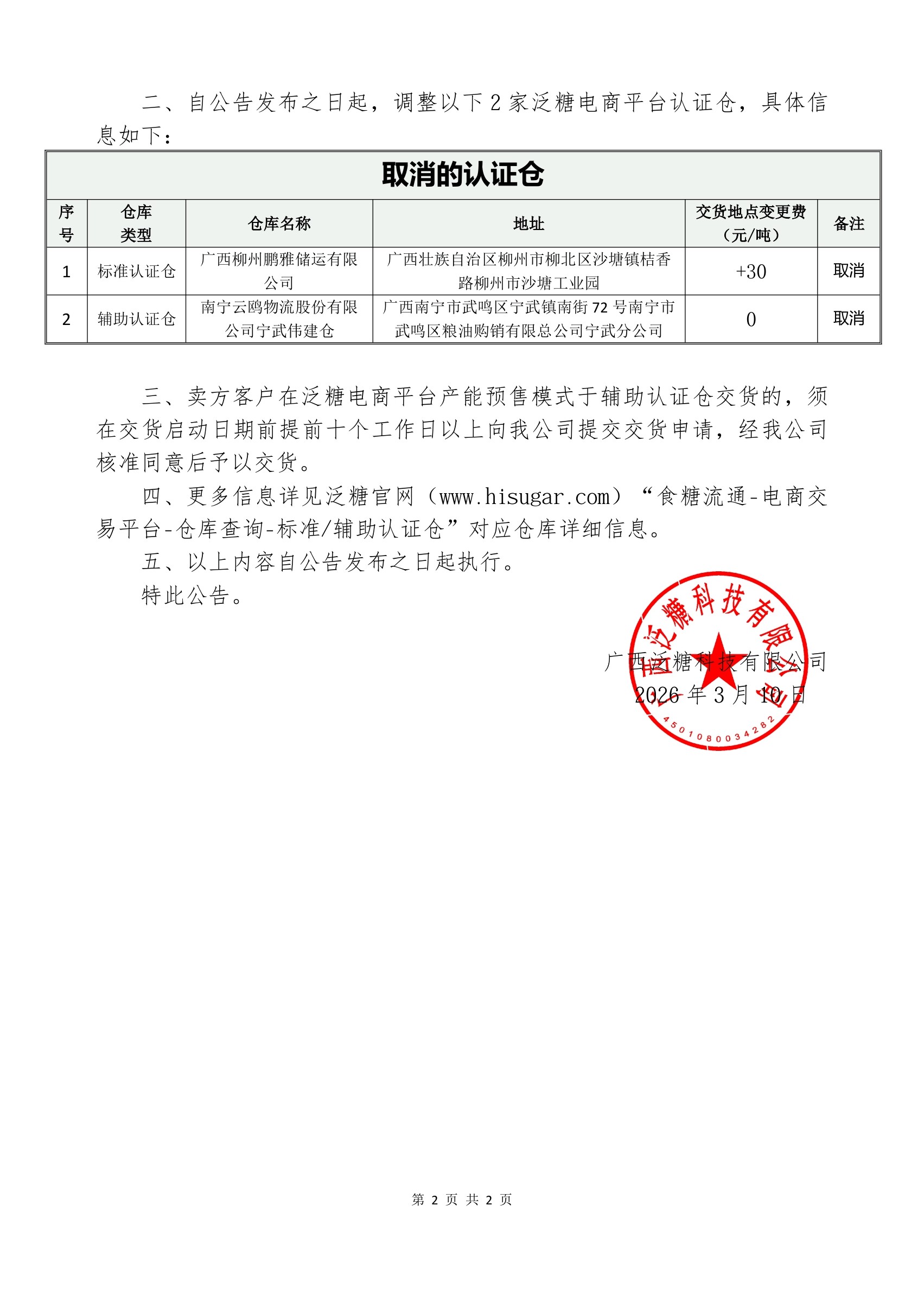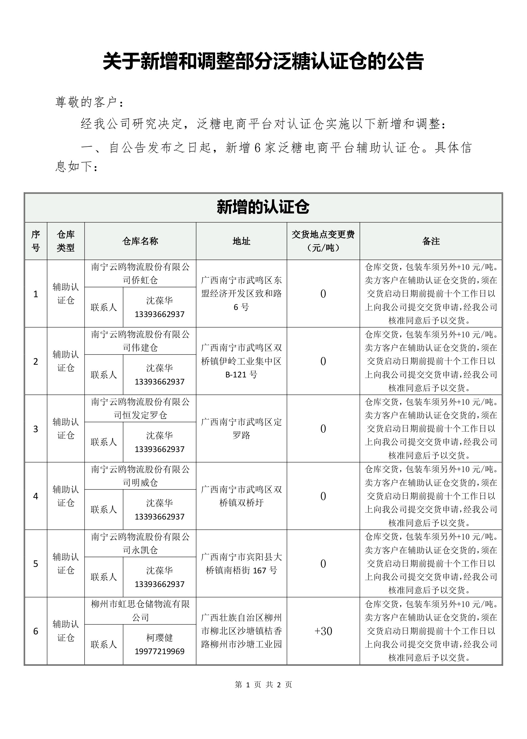关于新增和调整部分泛糖认证仓的公告