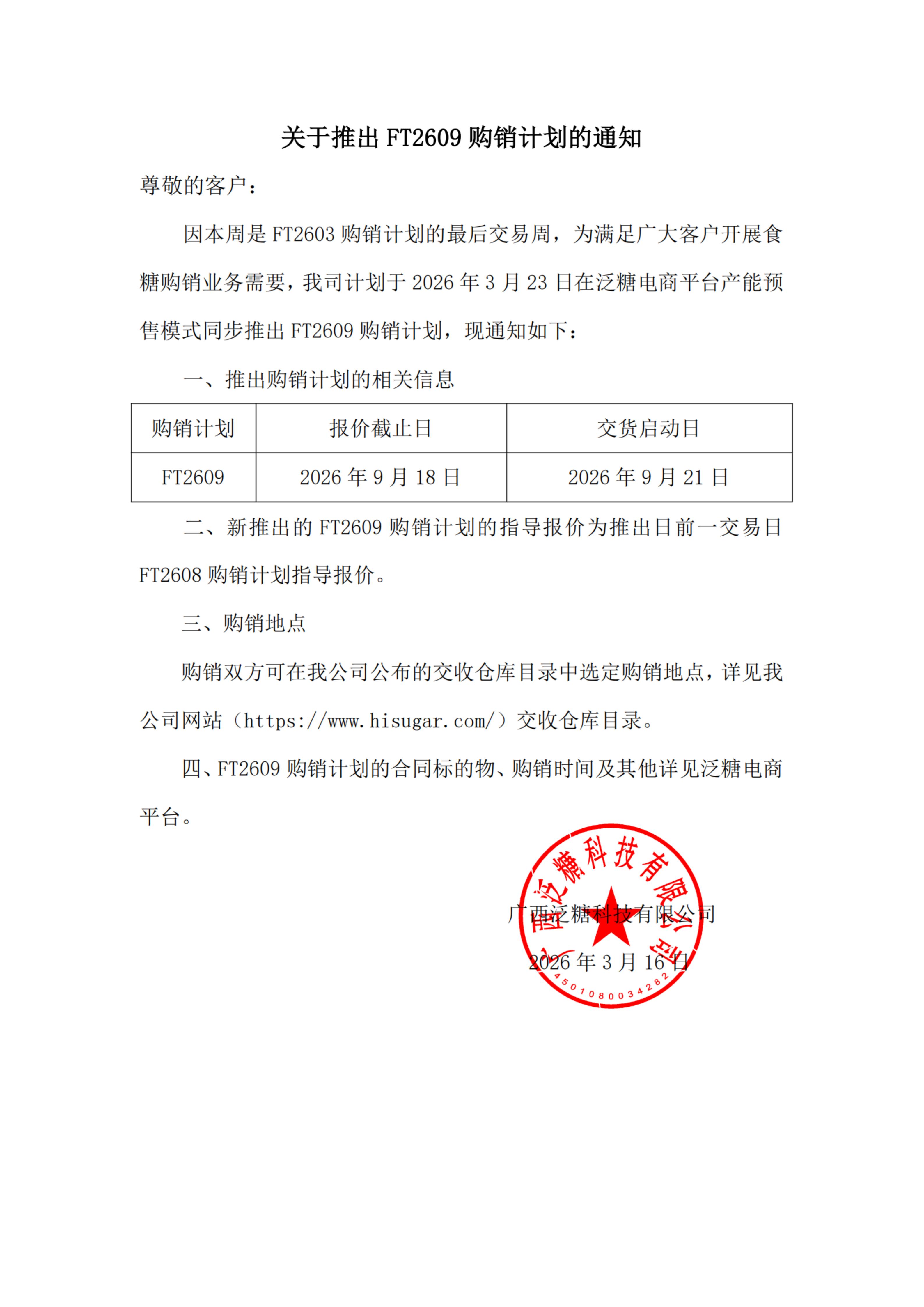 关于推出FT2609购销计划的通知