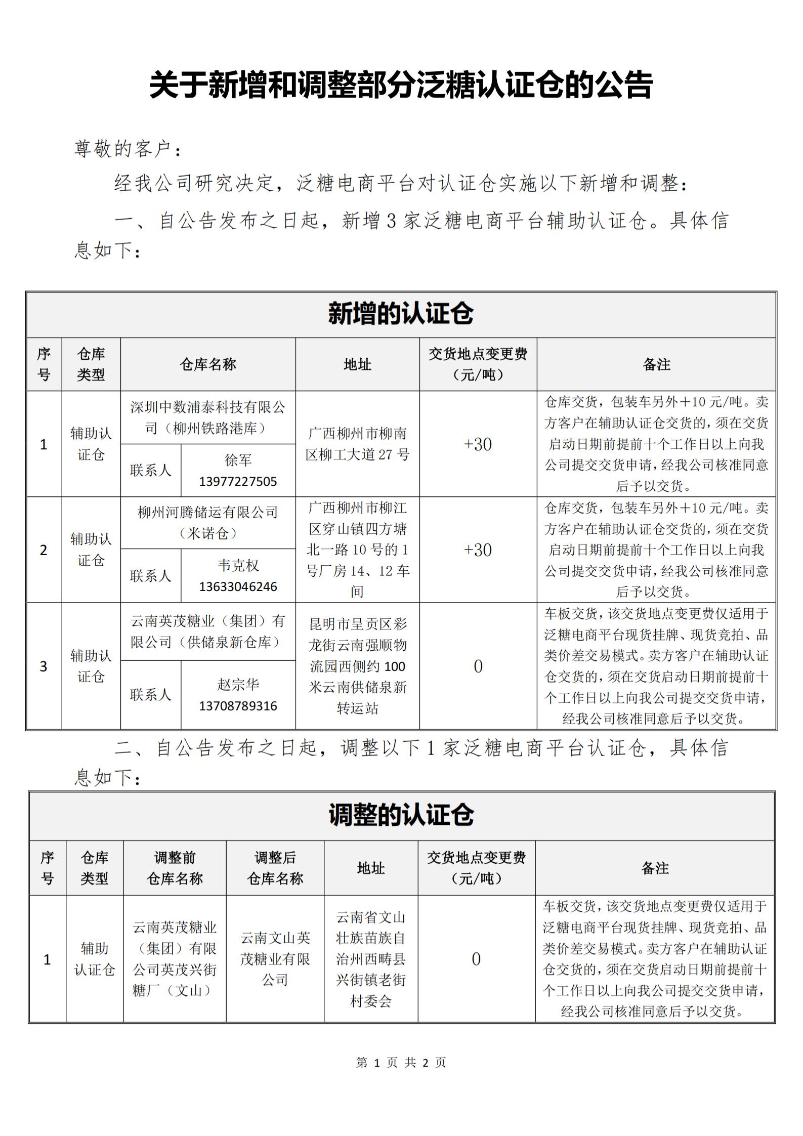 关于新增和调整部分泛糖认证仓的公告