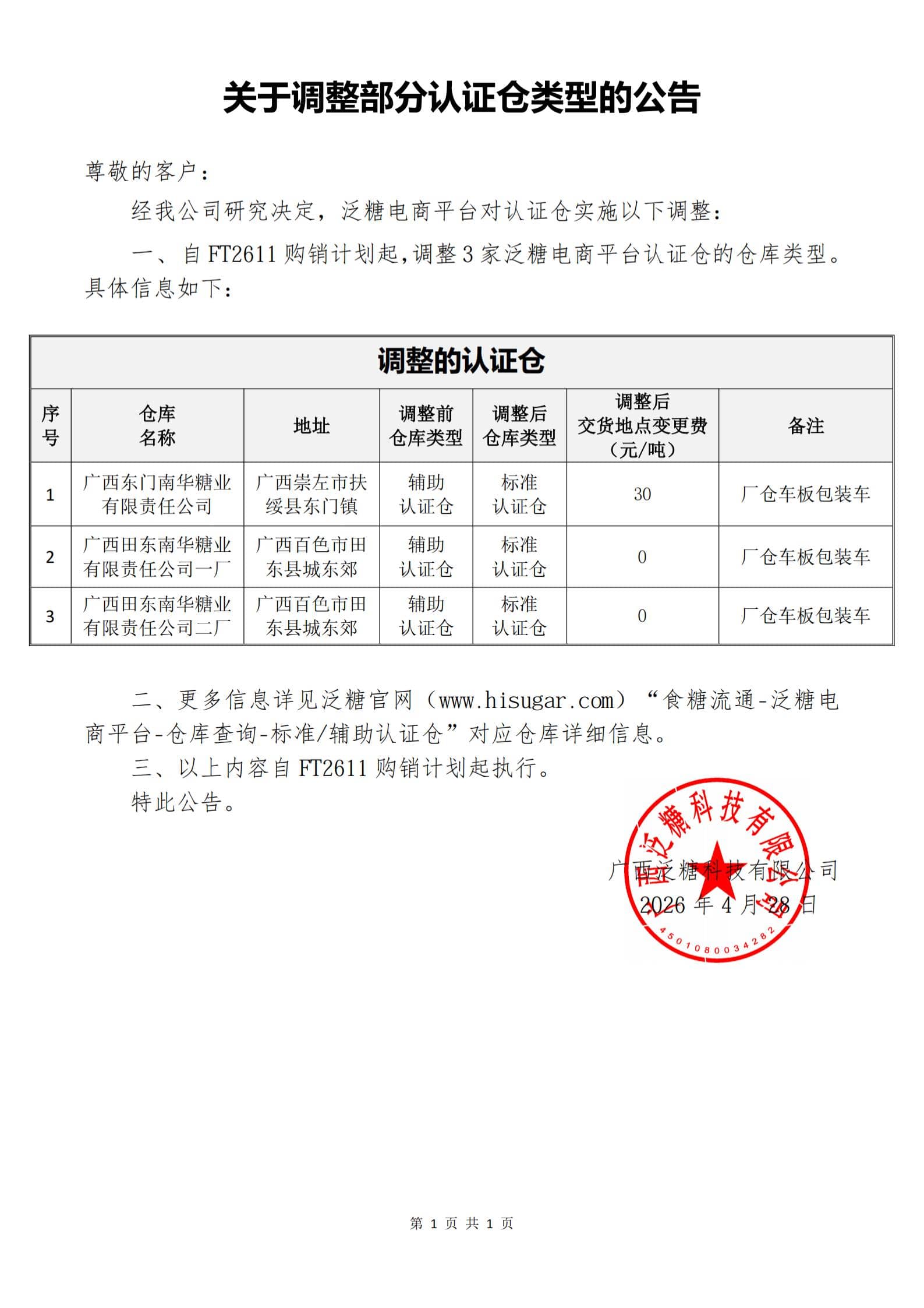 关于调整部分认证仓类型的公告