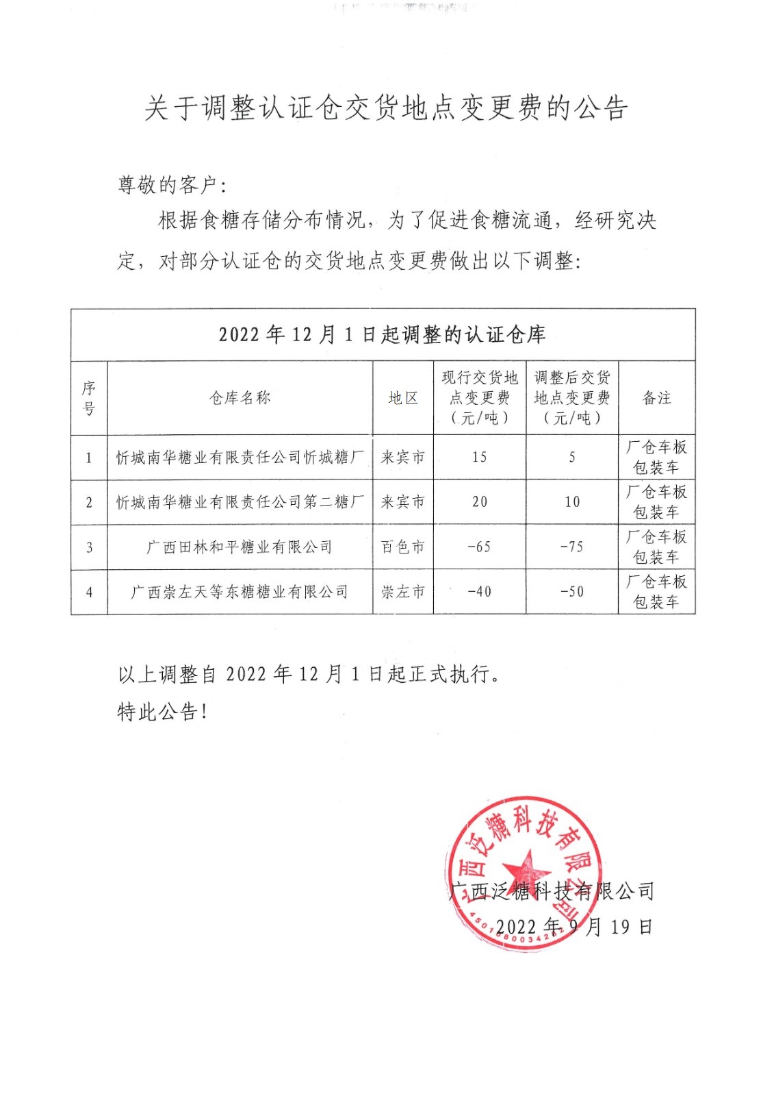关于调整认证仓交货地点变更费的公告